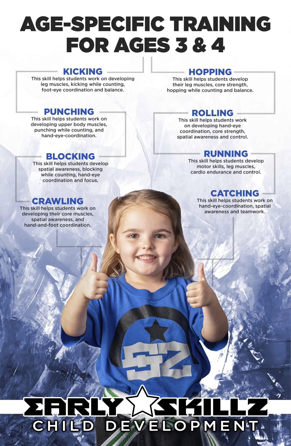 The Early Skillz program is specifically designed for the developmental needs of 3-4 year olds, focusing on physical, emotional, and social growth.